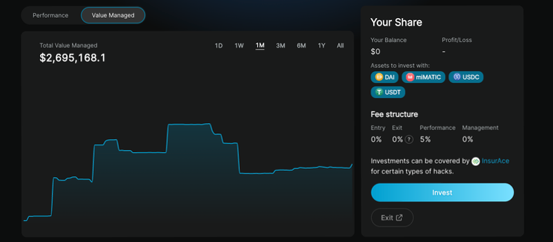 - In the Pool detail page we’ve included a new feature to review the history of the Pool Assets Under Management (AUM). This shows how the value of total assets has changed over time, also reporting on pool deposits or withdrawals. See “Value Managed” tab next to “Performance”.