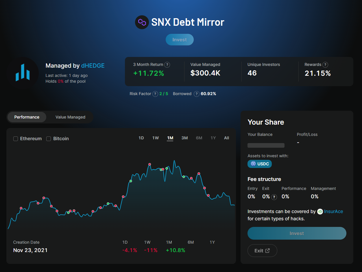 Synthetix 有一个债务池,所有 SNX 质押者必须相应地管理和对冲。SNX 债务镜像是一个由 dHEDGE 实施的债务镜像。这为用户提供了一键式解决方案。