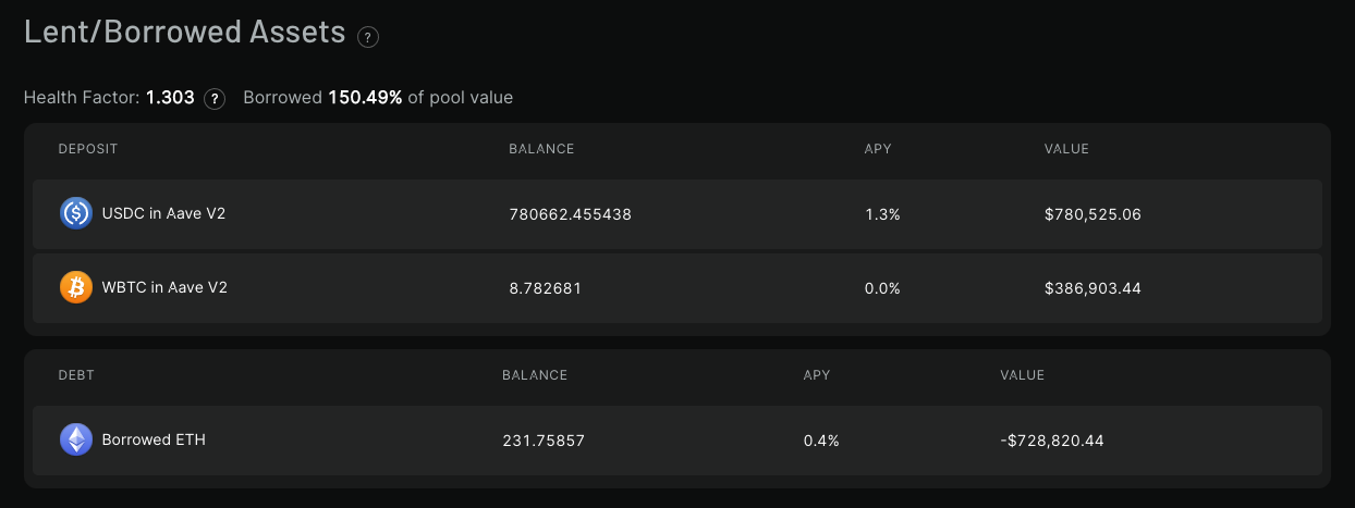 The pool below demonstrates a lending strategy with a short ETH position, including reporting on interest rates and debt Health Factor.