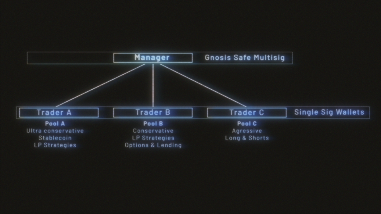 Delegation of portfolio is set by the DAO as manager, executed through the existing Multisig approval process. Once a portion of the Treasury is allocated to the manager, together with controls around whitelisted assets, the Trader is free to execute positions within those agreed limitations.