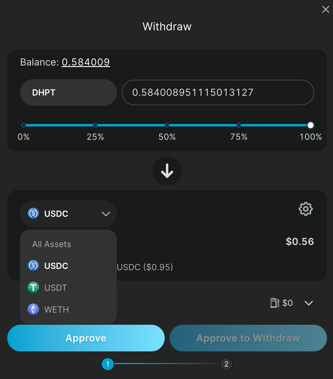 In this pool below, an investor looking to withdraw the full 0.584009 pool tokens (100% of their holding) is being presented with withdraw token options of either USDCm USDT, WETH. Even though this pool was holding a range of other tokens and Sushi LP positions.