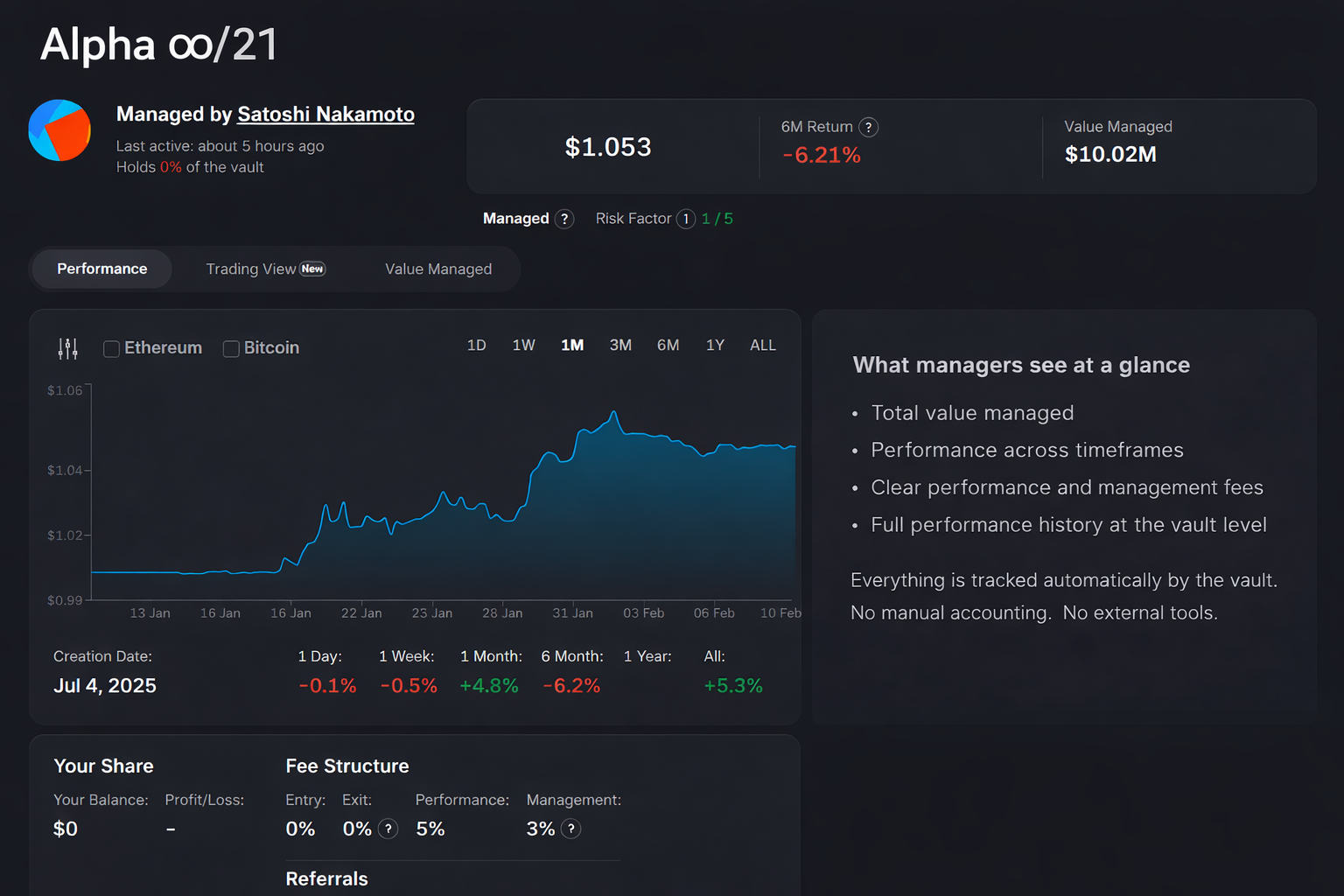 Vaults also offer clear and readable performance tracking for users. Performance history, fees, and results are presented in a way that users can understand, which helps build trust when real capital is involved.