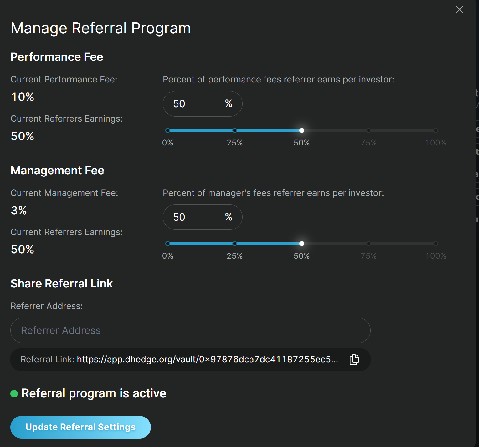Once enabled, you can set what percentage each referrer will earn per referral if you have performance fees enabled. Similarly, if you have management fees enabled, you can set the percentage that the referrer will earn per referral.
