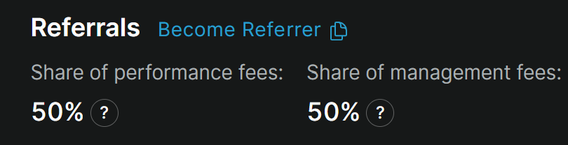 50% of a 3% Management Fee would mean the refferer would receive half of the Managert fee for usersthey have reffered to the vault.