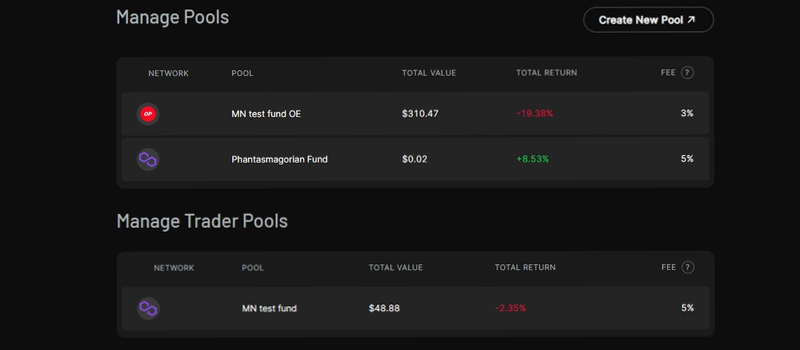 dHEDGE позволяет делегировать торговую активность пула другой учетной записи с ограниченными разрешениями. Они называются "Разрешениями трейдера". В случае, если вы были отмечены как Трейдер для пула, эти пулы теперь удобно отображаются в одном месте - на странице управления под заголовком “Управление пулами трейдеров”.