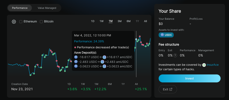 На странице сведений о пуле мы включили новую функцию для просмотра истории активов пула под управлением (AUM). Это показывает, как стоимость общих активов менялась с течением времени, а также сообщает о депозитах или выводах средств из пула. Смотрите вкладку “Управление стоимостью” рядом с разделом “Производительность”.